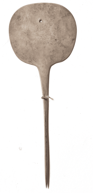 Las piezas de tipo cuchara, como ésta, podrían provenir de la época republicana. La mayoría de estos ejemplares fueron generados a finales del siglo XVIII, hasta el último tercio del siglo XIX. Su silueta en forma de cuchara representa la tipología más difundida, sobre todo en el sur Andino. Este ejemplar considerado una expresión de arte tradicional rural1 concentra su adorno en la parte cóncava, decorada al buril con una ornamentación de corte hispano.