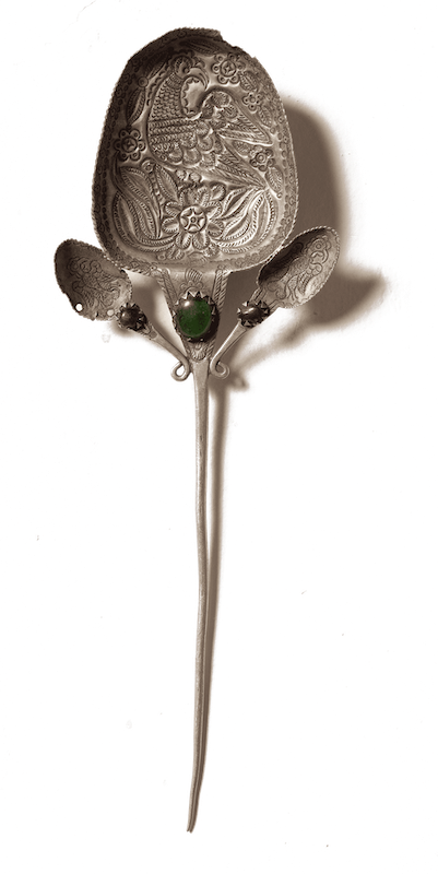 Las piezas de tipo cuchara, como ésta, podrían provenir de la época republicana. La mayoría de estos ejemplares fueron generados a finales del siglo XVIII, hasta el último tercio del siglo XIX. Su silueta en forma de cuchara representa la tipología más difundida, sobre todo en el sur Andino. Este ejemplar considerado una expresión de arte tradicional rural1 concentra su adorno en la parte cóncava, decorada al buril con una ornamentación de corte hispano.